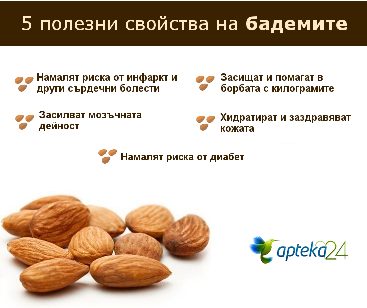 5 полезни свойства на бадемите Публикуван на: 27 декември 2016 1 от 2 Бадемите да ядки с редица полезни действия за здравето. В тази инфографика ви представяме най-важните от тях. Натиснете върху изображението за цял размер.
