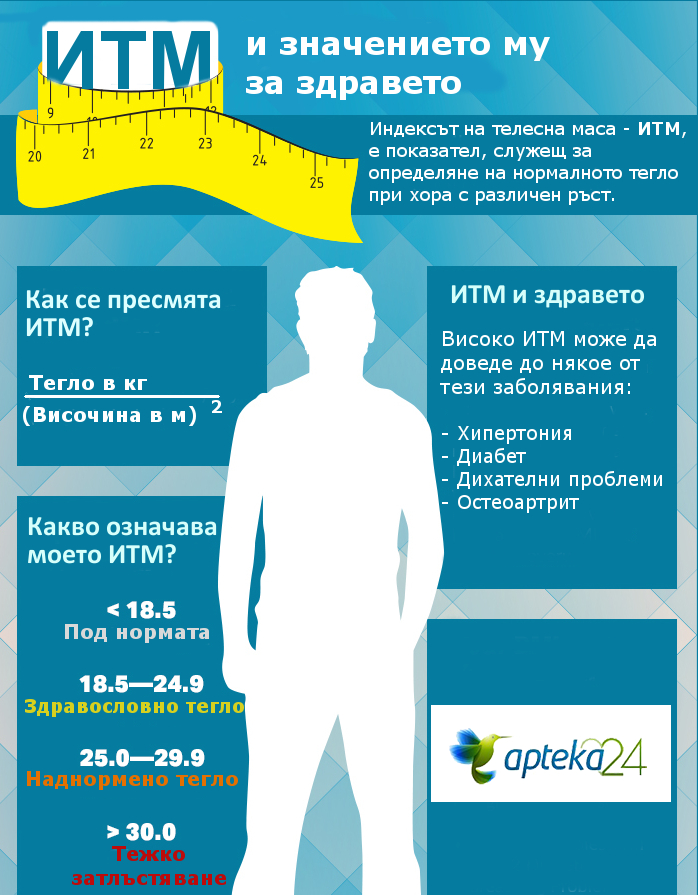 ИТМ и значението му за здравето Публикуван на: 14 декември 2016 1 от 2 Индексът на телесна маса - ИТМ, е показател, служещ за определяне на нормалното тегло при хора с различен ръст. Научете още за него в нашата инфографика.