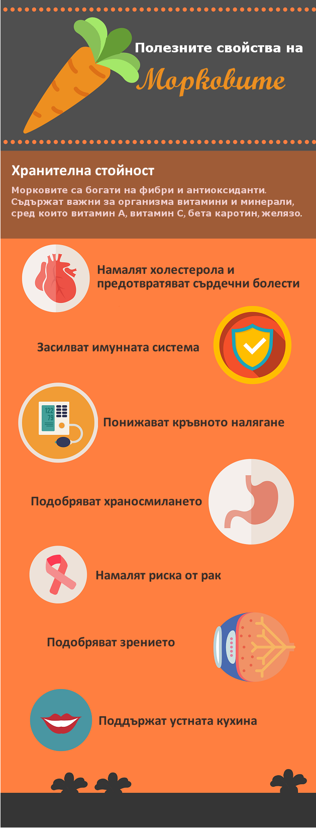 Полезните свойства на морковите Публикуван на: 26 януари 2017 1 от 3 Може би след картофите, морковите са най-популярното кореноплодно. Те не само имат голямо приложение в кулинарията, но и претежават редица полезни за организма вещества. Научете повече от инфографиката по-долу.