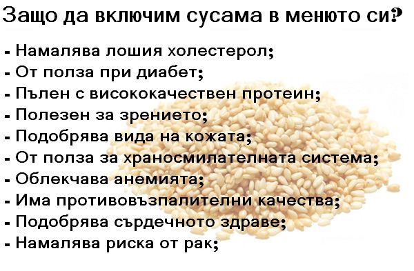 Сусамът е една изключително полезна храна, която често не включваме в менюто си, а трябва! Тези малки семенца са бомба от витамини и минерали, необходими за правилното функциониране на редица телесни процеси.